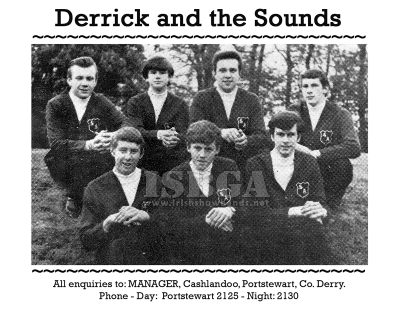 In 1962, in Omagh, Co. Tyrone, a group of schoolboys at Omagh Academy got together and formed a band called The Strollers. Having played locally for a couple of years, and built up a following, they added some musicians and changed their name to Sounds Anonymous. Their handsome young keyboard player Derrick Mehaffey took most of the lead vocals and in 1966, managed by Bobby Platt, they went professional as Derrick & The Sounds. Along with Derrick in the band’s line-up at this time were Richard McCracken (lead guitar), Richard Sharpe (bass), Mervyn Martin (drums), Raymond Gourley (guitar), Bill McCracken and Ralph Lyons (saxophones). Their programme was made up mainly of chart hits and big ballads with strong brass arrangements and harmonies. They were unique in that they had their own musical director, Jimmy O’Neill, who was not a member of the band. Jimmy arranged some of their popular brass instrumental numbers such as “Hall Of The Mountain King” and “The William Tell Overture”. Their first single Power Of Love gave them an Irish Top 10 hit in 1968 and this was followed by My Sly Sadie, Morning Papers And Margarine (1969), Needing You an original composition by trumpeter Damien Given (1970) and My Guitar (1971). All their singles proved to extremely popular on national radio and still stand the test of time today. The Sounds made many television appearances both in Ireland and Britain and also toured Canada and Germany. They had a huge following in Northern Ireland, but also packed the crowds in in places like Cork, Limerick and Dublin. In 1970, The Sounds almost made it to Top Of The Pops, but not as Derrick & The Sounds. A record producer had recorded a single called Love Grows (Where My Rosemary Goes) with session singers and musicians and released it under the name Edison Lighthouse. However, when the single began climbing up the charts and Top Of The Pops beckoned, there was no band to perform the song on television! Frantic phone-calls were made and the Omagh lads flew to London to become Edison Lighthouse. However, on the same day, someone else from the record company had signed a British band to do the job and the transformation never materialised. The song reached No.2 in the charts. Like most bands, The Sounds had some changes in personnel during their years on the road. Unusually, at a time when some beat-group musicians were joining showbands, two members of The Sounds teamed up with blues-guitarist Rory Gallagher to form Taste. Richard McCracken, who switched from lead guitar to bass and drummer John Wilson. They were replaced by drummer Vic McNamara from Dublin beat-group, The Strangers and guitarist John Murphy. Later Séamus Quigley (tenor sax), Johnny Blackledge (bass guitar), Malachy Kearns (tenor sax/vocals) and Séamus Caulfield (drums) joined the band. Derrick Mehaffey left the band in 1971, spent a while with The Royal Showband and The Conquerors and then emigrated to Canada where he continued to perform and record. These days he sings with The Foyle Showband. After Derrick left, Malachy Kearns took over lead vocals and released a single called “Twilight Time”, a revival of a ballad which had been a big hit for American vocal group The Platters. All text is strictly copyright of Irish Bands Archive and should not be copied or published anywhere without written permission |